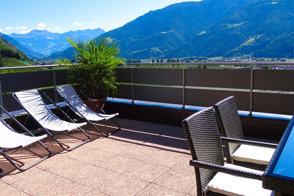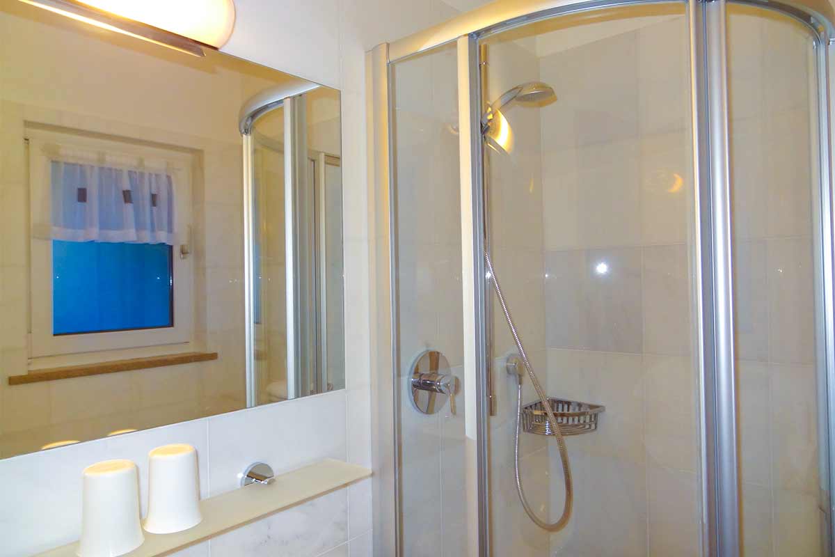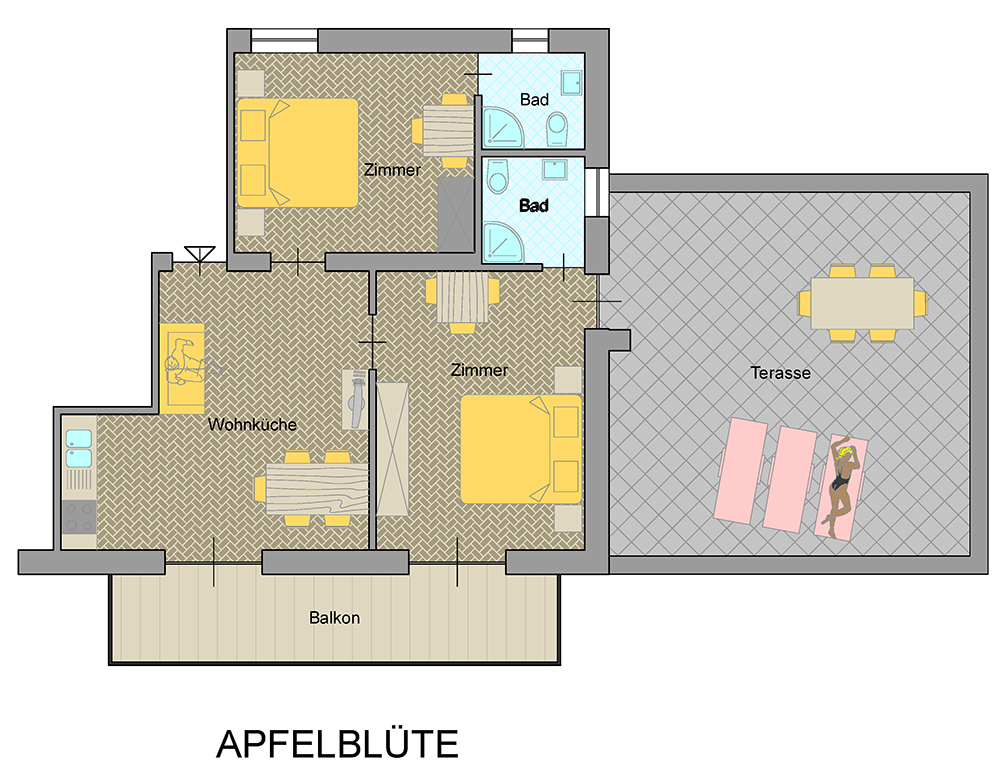 Unsere Ferienwohnung "APFELBLÜTE" verfügt über einen Wohnraum mit Küchenzeile und ausziehbarer Doppelbettcouch, zwei Doppelbettzimmer, zwei Badezimmer mit Dusche/WC, Terrasse und Balkon mit tollem Ausblick.