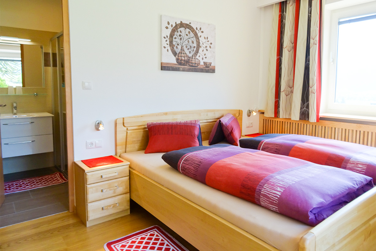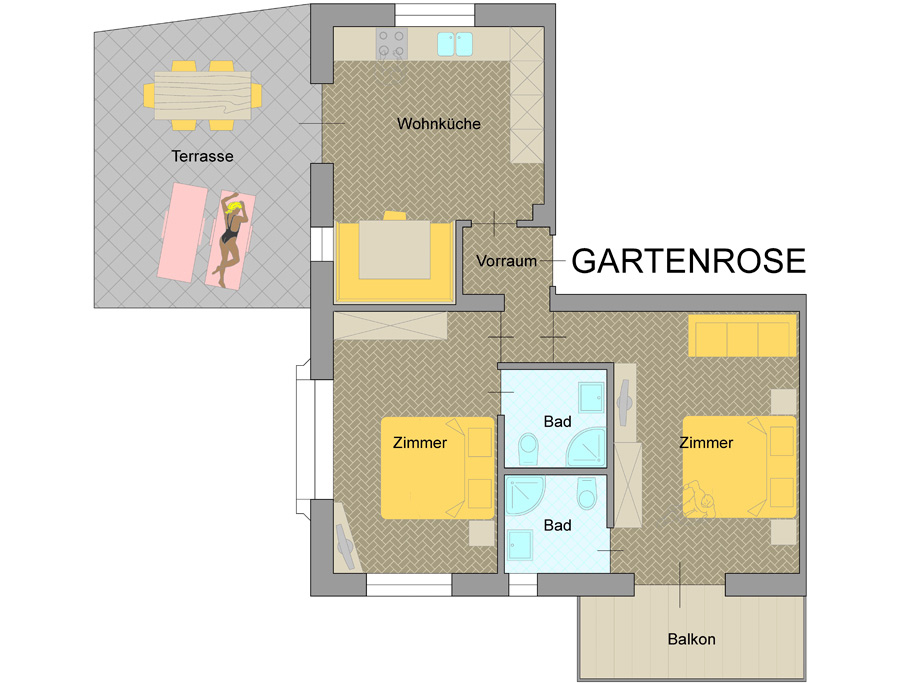 Unsere Ferienwohnung “GARTENROSE” verfügt über einen Wohnraum mit Küchenzeile, zwei Doppelbettzimmer (mit zusätzlichem Schlafsofa), zwei Badezimmer mit Dusche/WC, Terrasse und Balkon mit tollem Ausblick.